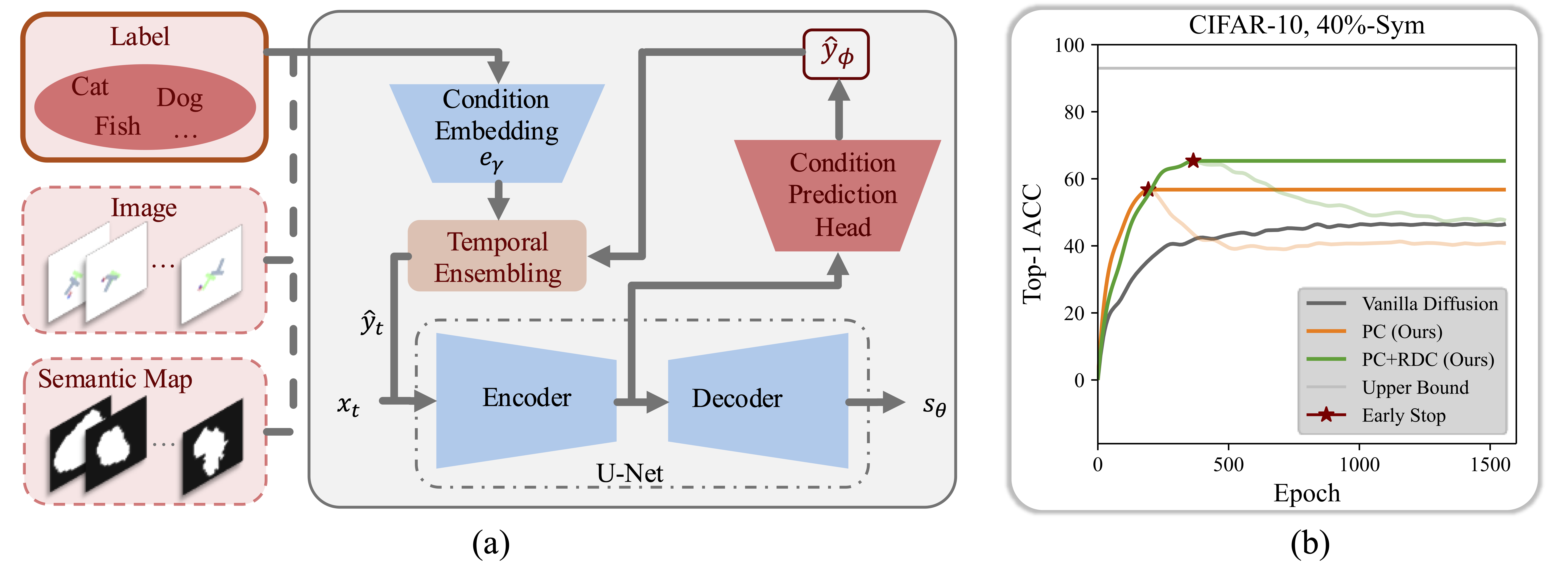 - Update: We update \( \hat{y} \) to approximate the clean condition \( y \) using temporal ensembling and early stopping. The update \( \hat{y}_{\phi} \) is predicted by a lightweight prediction head added to the diffusion model U-Net encoder (Figure 1(a)).