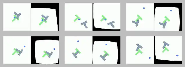 We conducted visuomotor policy generation experiments on the noisy Push-T dataset, where the task is to push a gray T-shaped block to a green target using image observations. Condition noise is simulated via radial (center magnification) and tangential (misalignment stretch) camera distortions, applied with probability \( \eta \) = 20%, 40%, 60%, 80% within preset intensities. As shown in Figure 5, we illustrate the differences between the original clean observations and the synthesized clean observations in the training set under 60% camera distortion.